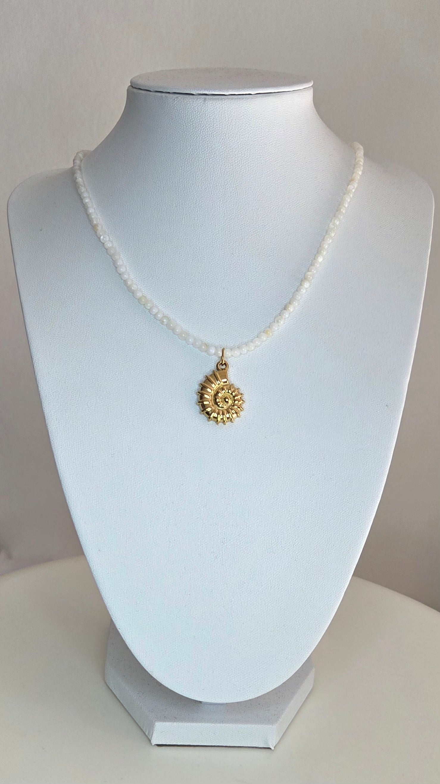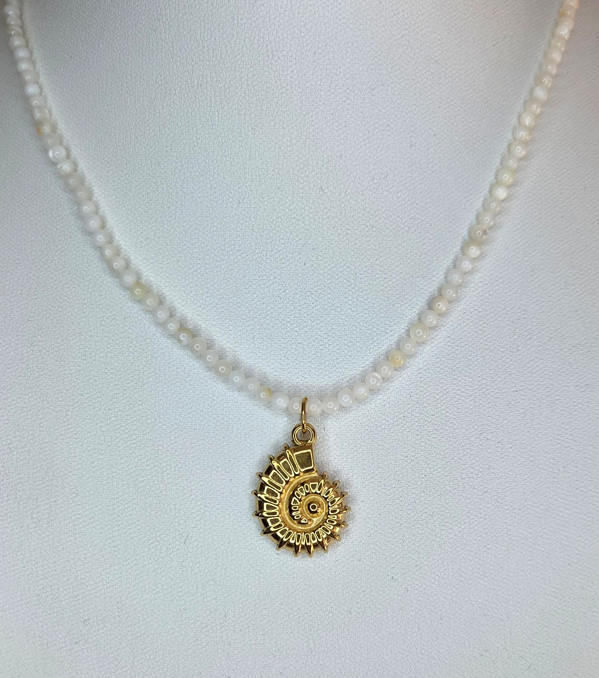 Choker fait main en perles de nacre naturelles et acier inoxydable, ajustable.
